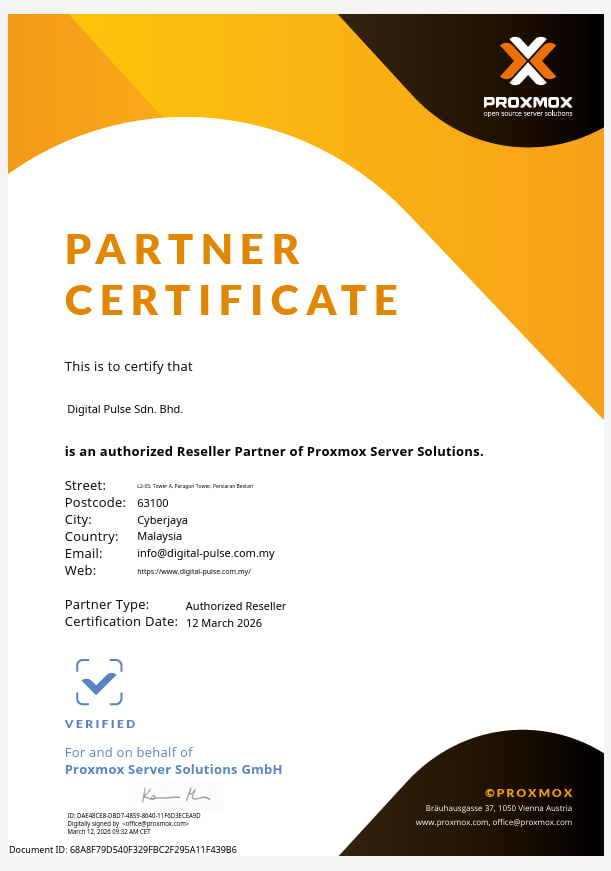 Digital Pulse is an authorized Proxmox reseller and certified partner in Malaysia. With over nine years of experience, we have been a dedicated Proxmox partner in the Malaysian market.